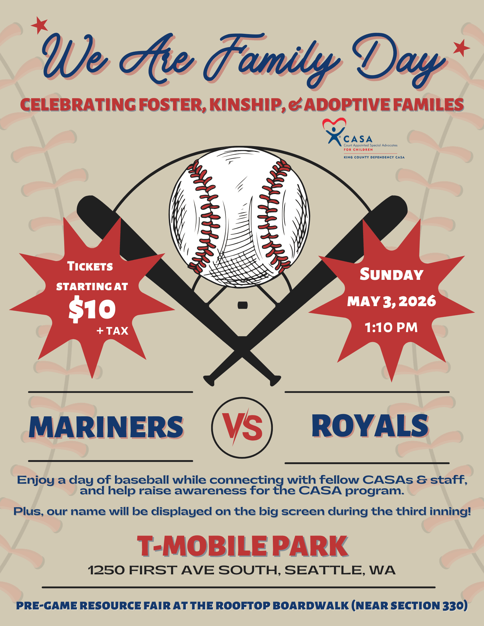We are excited to share a connection opportunity at the Mariners vs Royals “We Are Family Day” game on Sunday, May 3, 2026, at 1:10 PM at T-Mobile Park.